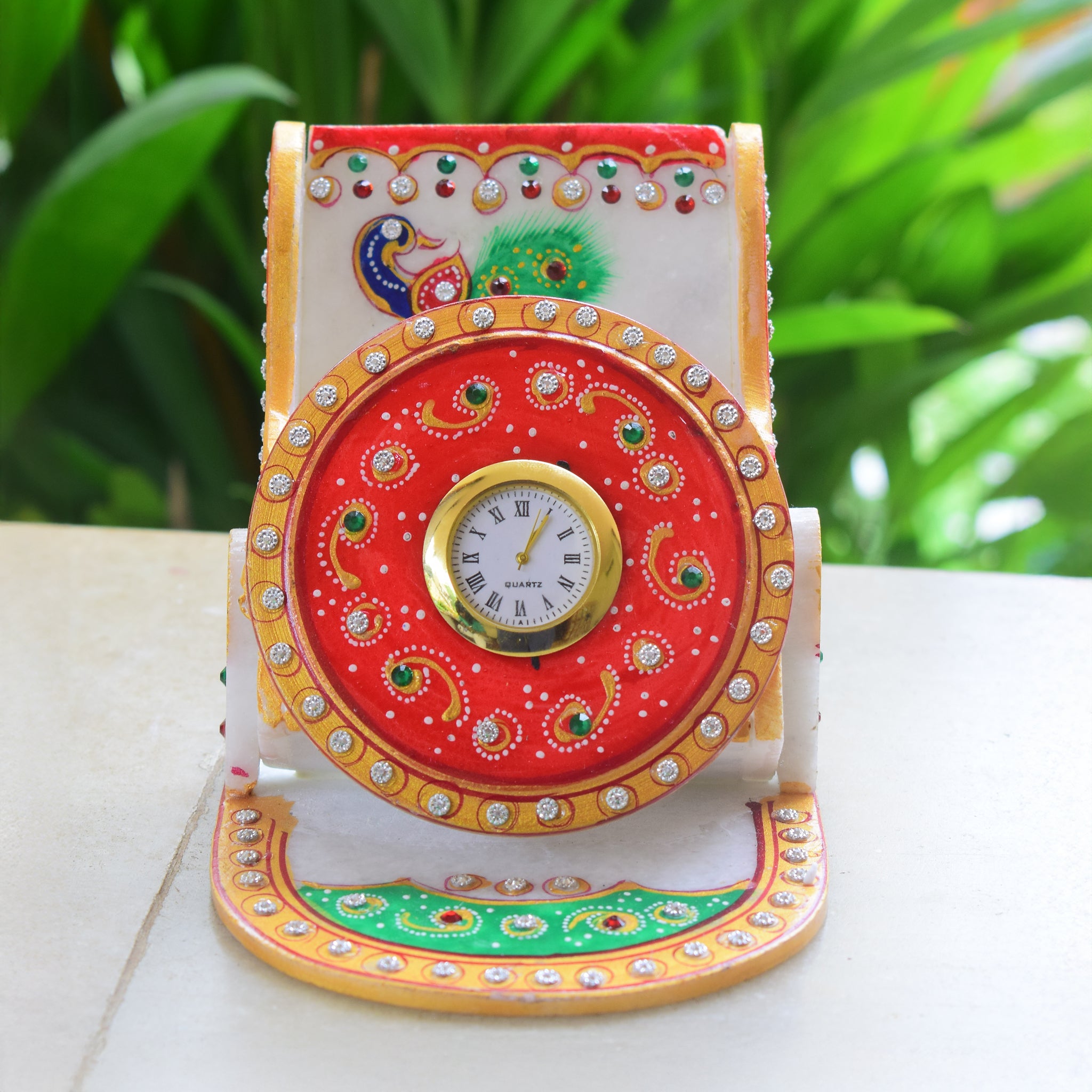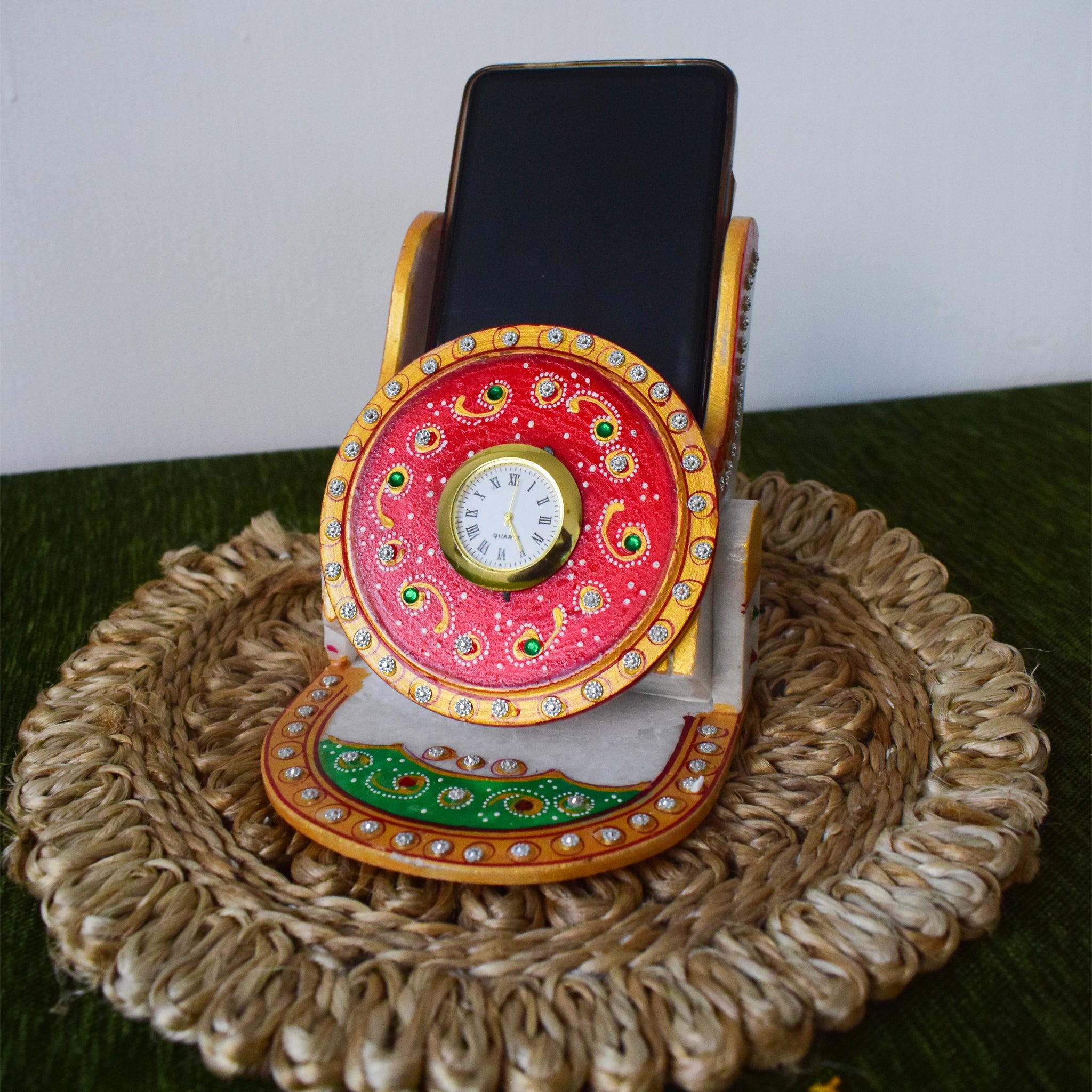 Kishangarh Marble Phone Stand with Hand-Painted Peacock and Clock
