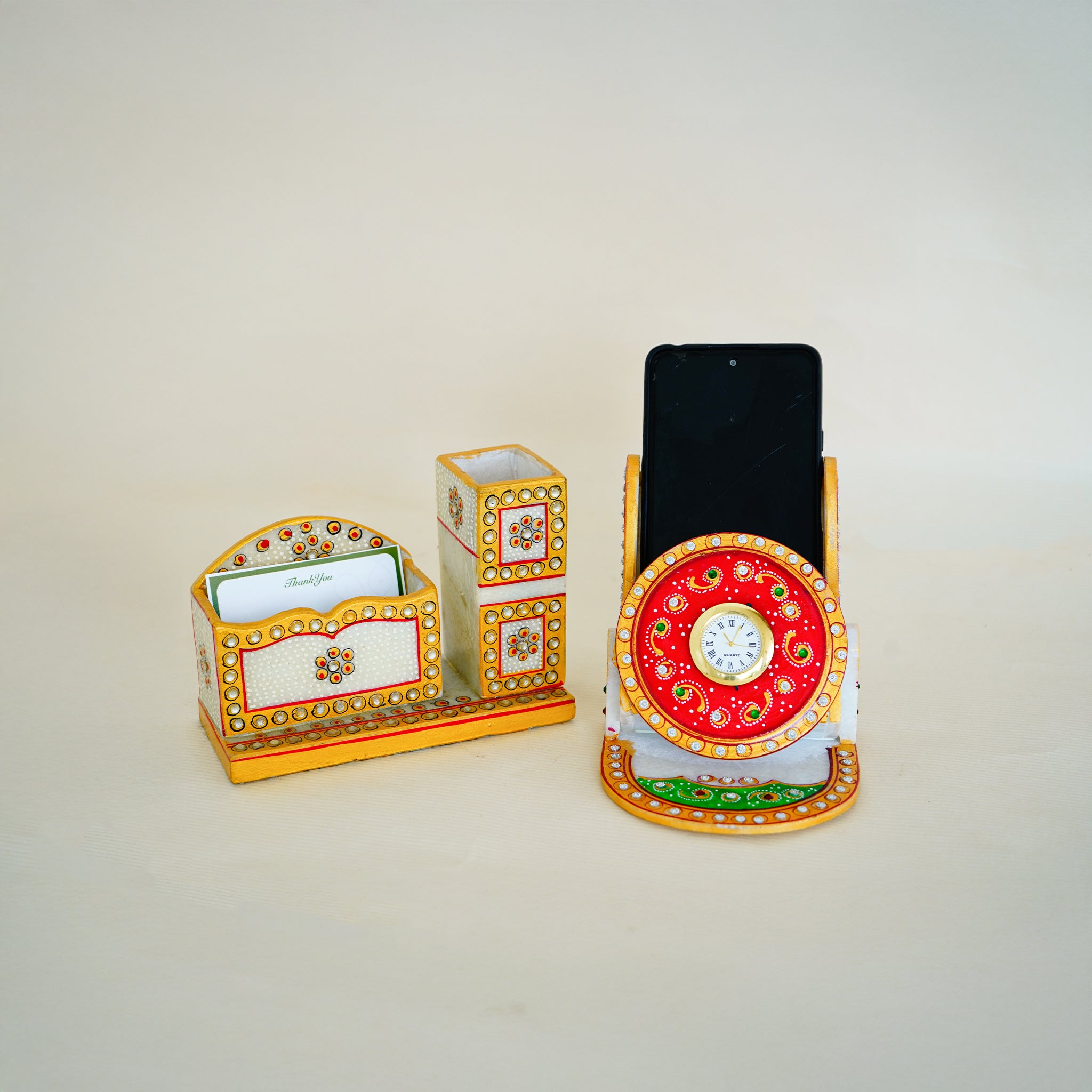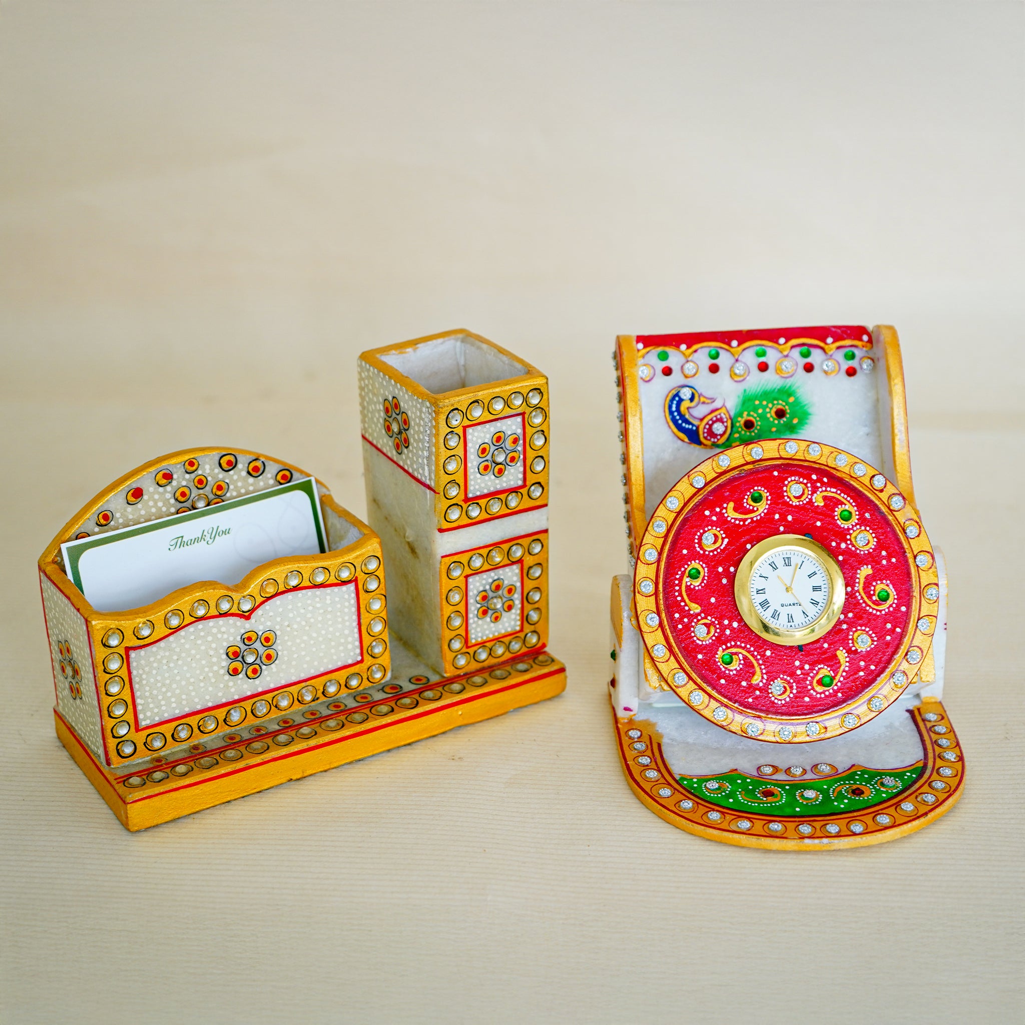 Kishangarh Marble Professional Combo Card Holder and Hand-Painted Peacock Clock