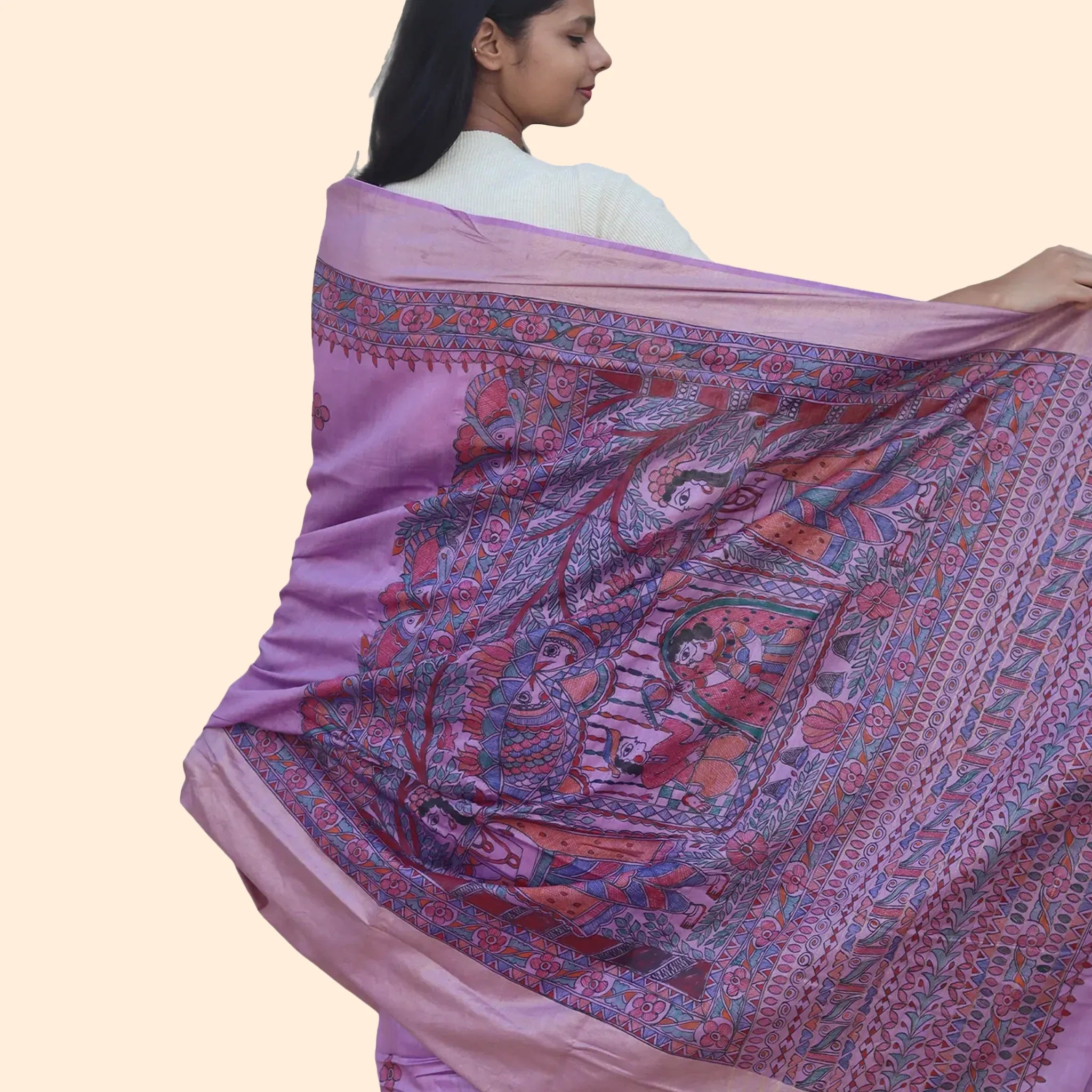 Purple Colored Munga Silk Saree With A Red Madhubani Worked Border