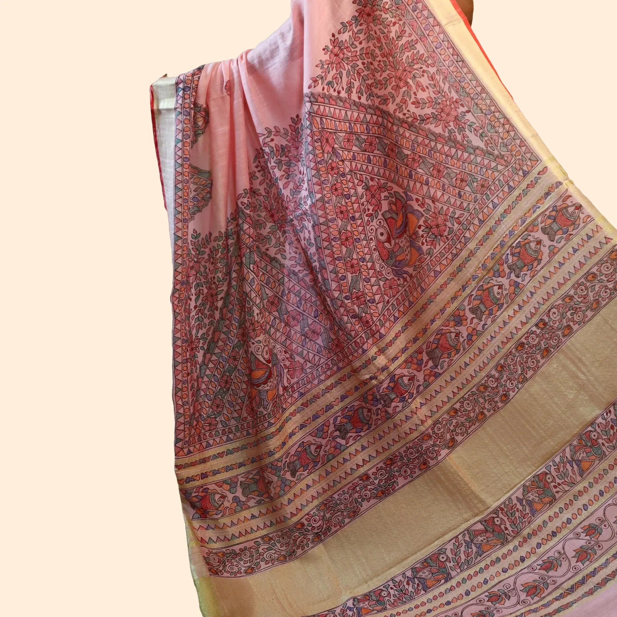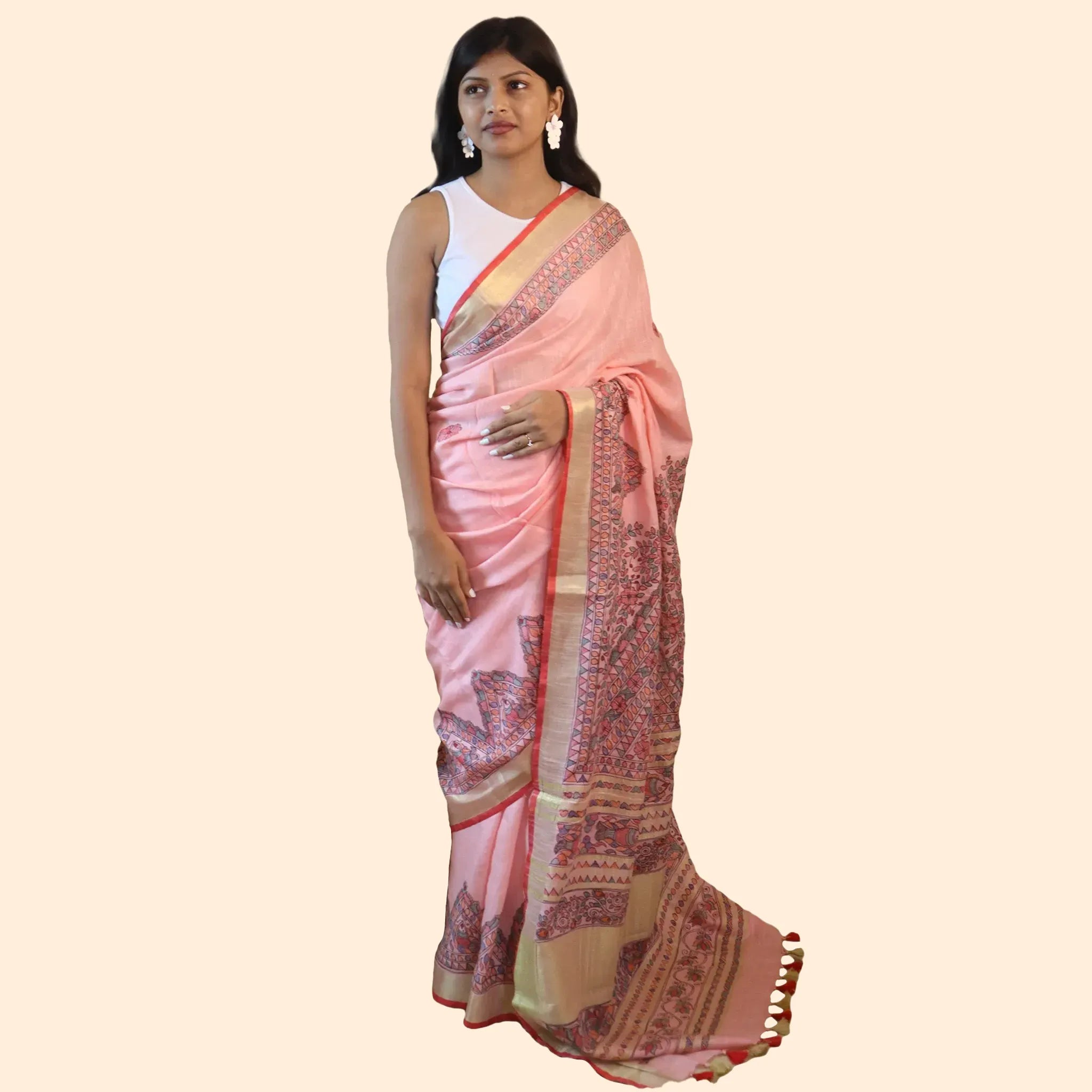 Pink Cotton Linen Saree with a Black Madhubani Bordered Design