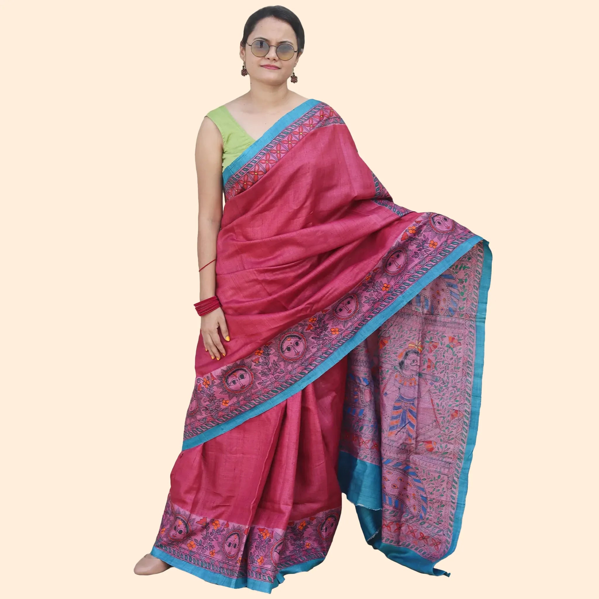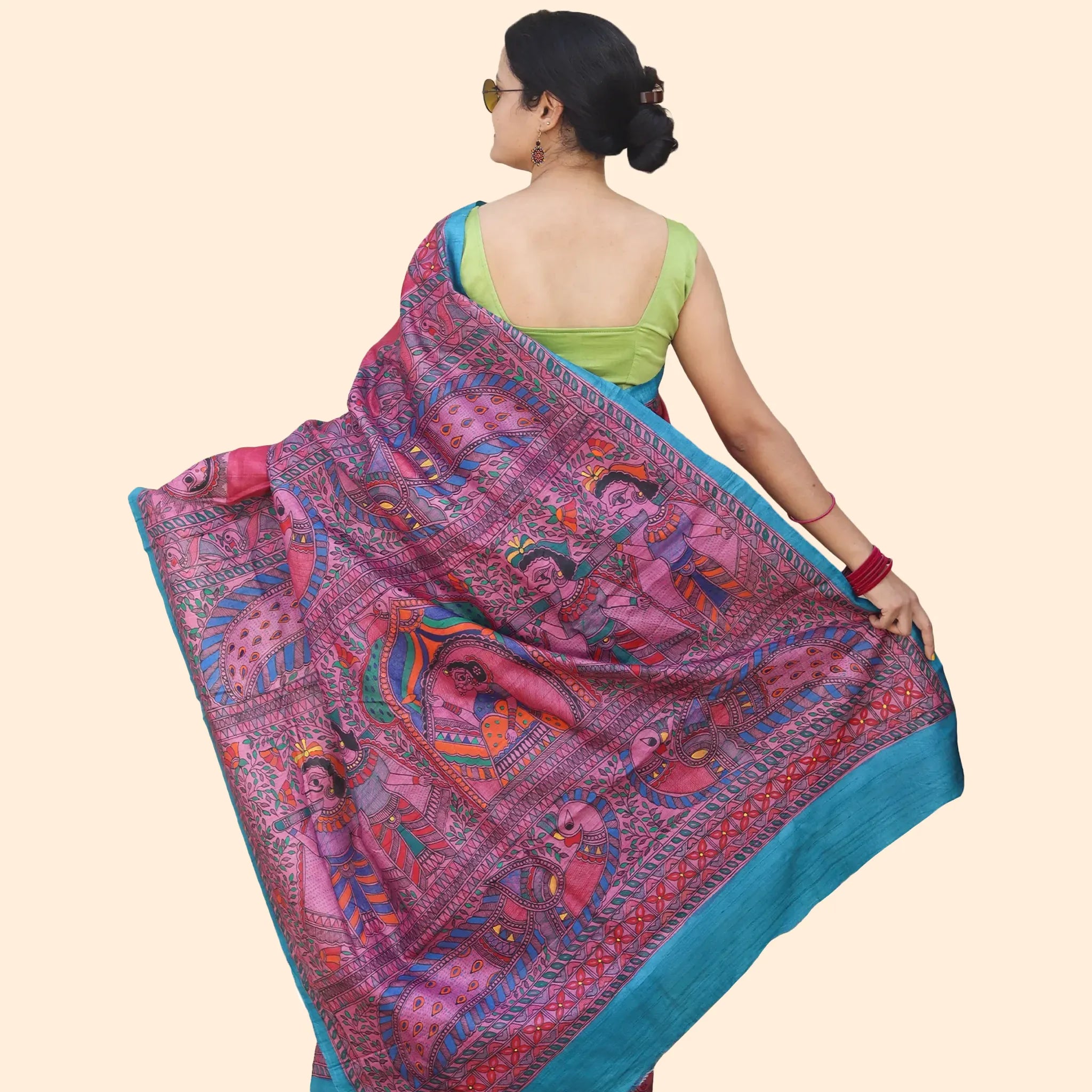 Hand-painted Madhubani Rani Pink Tussar Silk Saree-Made to Order