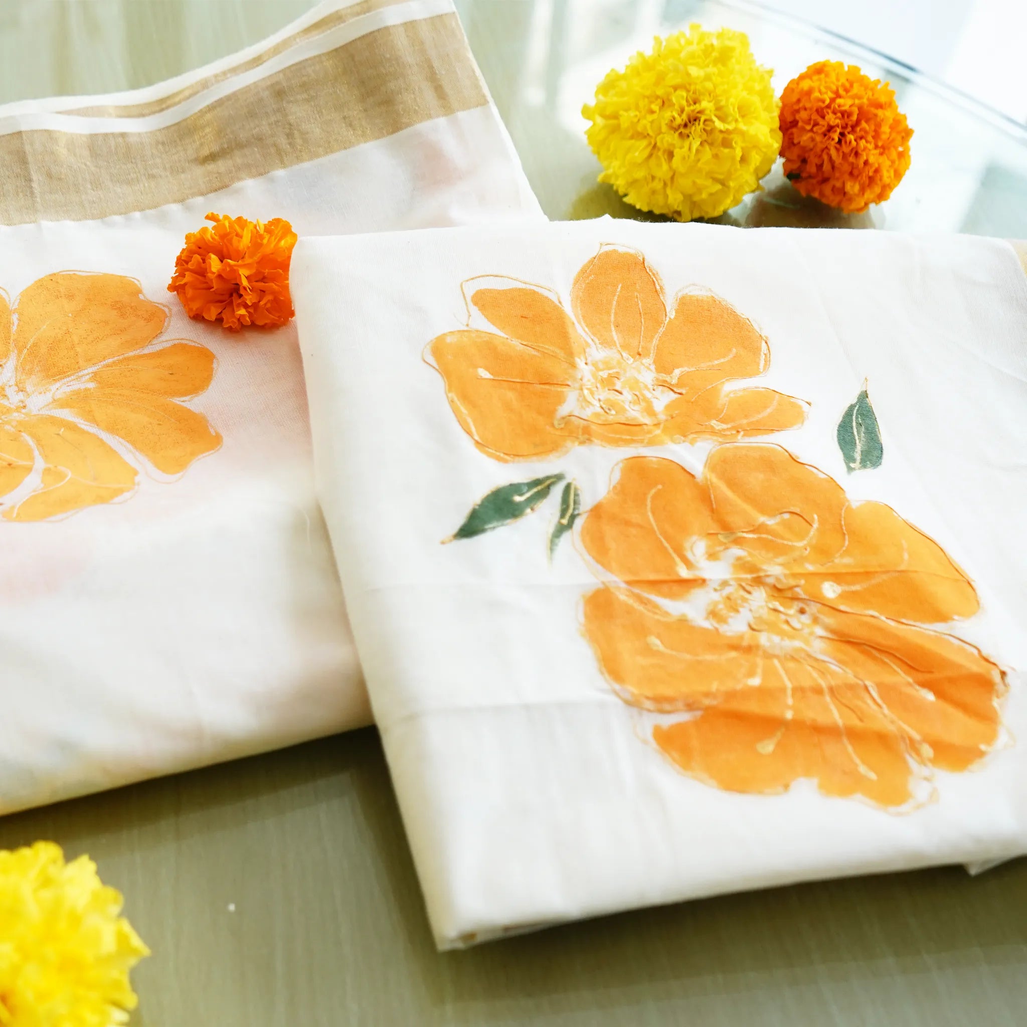 Kerala Kasavu Saree - Bold Orange Floral Hand-Painted Design with Blouse