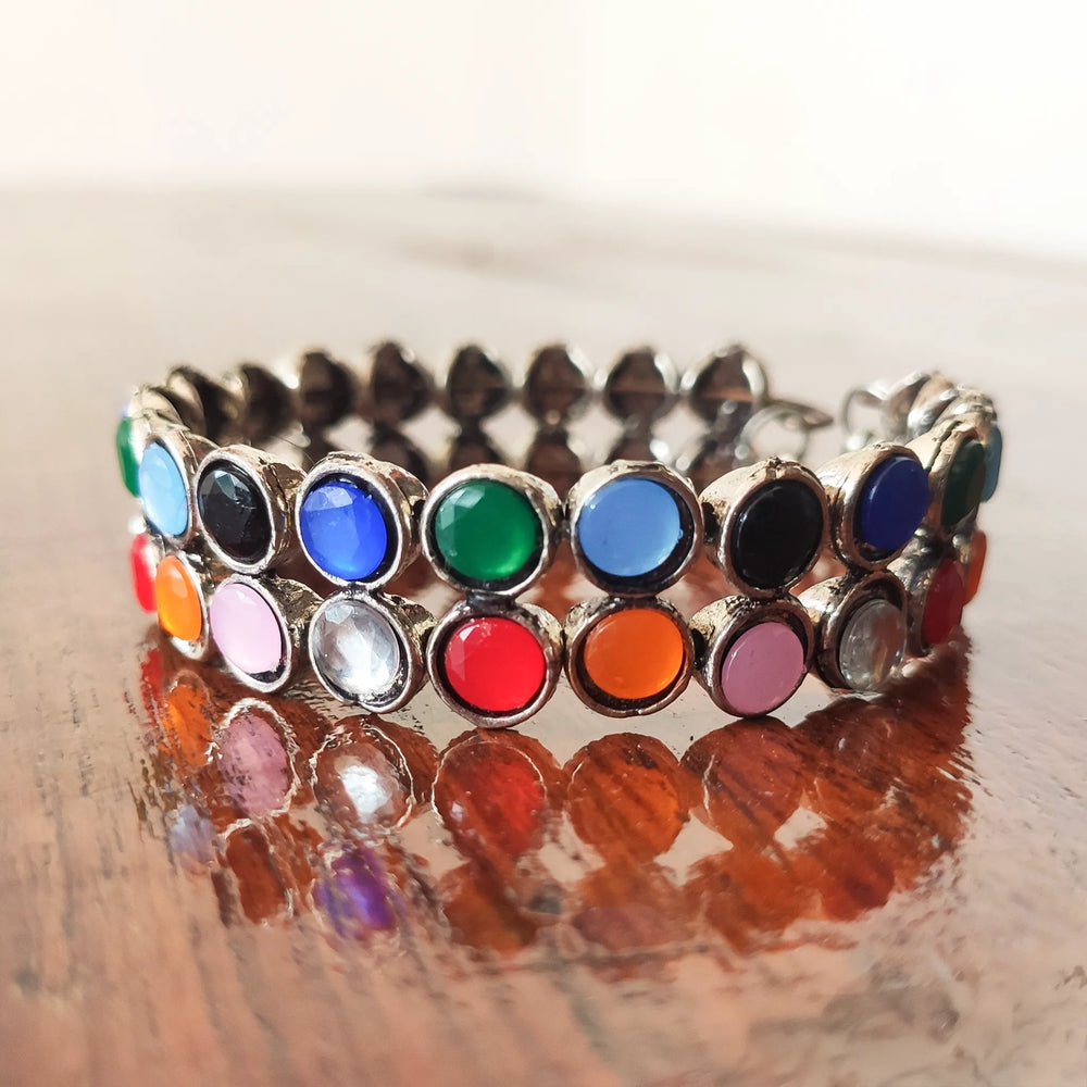 German silver two-layer bracelet with multicoloured stones — an oxidised ethnic bracelet with vintage charm for festive and everyday wear.